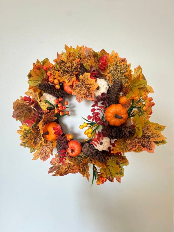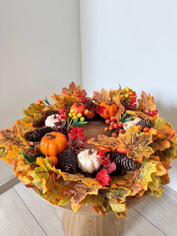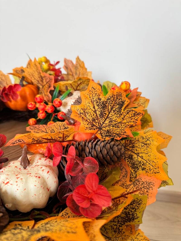 Herfstkrans met pompoenen en dennenappels! Haal de warme kleuren van de herfst in huis met deze rijk versierde krans. Gevuld met herfstbladeren, kleine pompoentjes, denneappels en bessen is dit de perfecte decoratie voor het najaar. Hang hem aan de deur of leg hem op tafel met een kaars in het midden en geef je interieur een gezellige herfstsfeer!